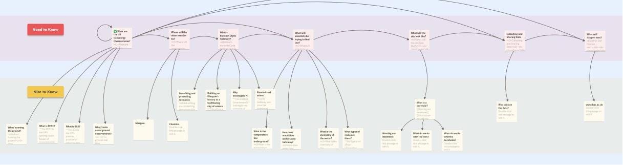 The objective of this project was to create and test an interactive tour of an underground observatory location, targeting various user groups including the public, academics, industry, and students. By grouping frequently asked questions (FAQs) specific to each user group and offering different tour durations of 3, 7, or 15 minutes, users could customize their experience. Using the Twine tool, I visualized user journeys with branching paths to accommodate different content preferences.